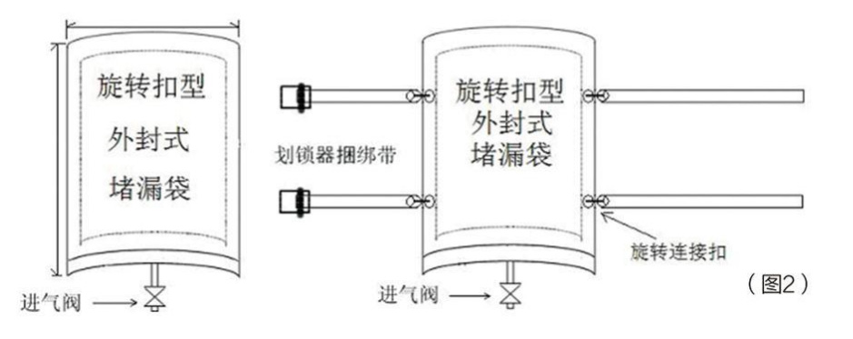 - 2、旋轉(zhuǎn)扣型:應(yīng)用在金屬、塑料、玻璃鋼材質(zhì)的各類管道、罐車、容器罐人為損壞或腐蝕穿孔跑、冒、滴、漏導(dǎo)致的圓孔、橢圓孔類泄漏充氣應(yīng)急之用,或大型落地式容器罐體底部泄漏,先將堵漏袋拉緊在泄漏部位表面后充氣達(dá)到堵漏的目的。(見(jiàn)圖2)
